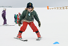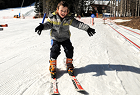 Une maman accompagne son enfant débutant sur des skis à l’école de ski de Prabouré.